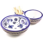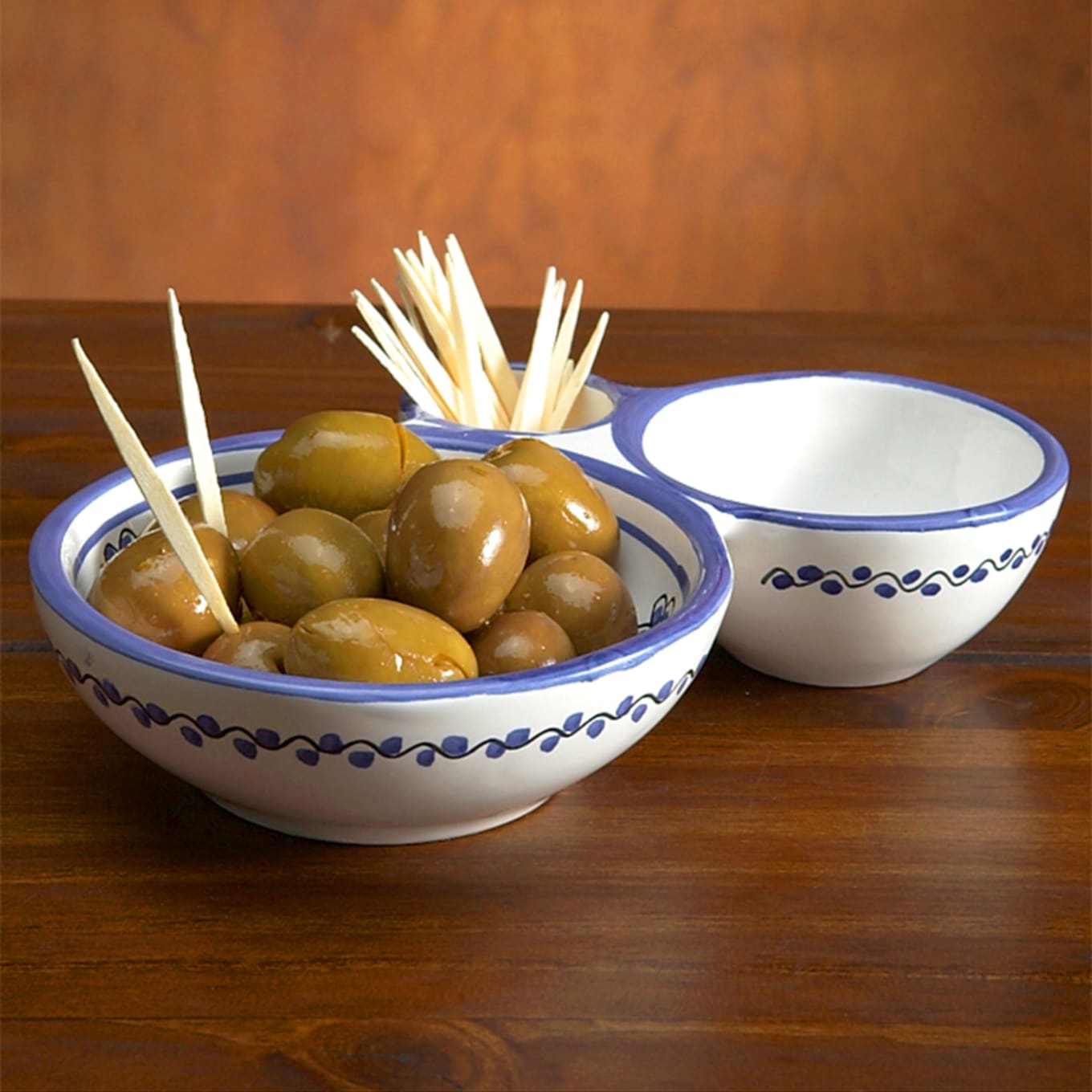 Here is a piece of practical folk art, so to speak, that solves the age-old problem of what to do with the pit of the olive you just ate. This hand-painted ceramic dish is an ingenious invention from Spain - the perfect way to serve your favorite Spanish olives at a party. Put the olives in the bowl; put a bunch of toothpicks in the small side bowl. The remaining small bowl is for the pits - the Spanish call them 'huesos' bones! Your guests will be delighted.