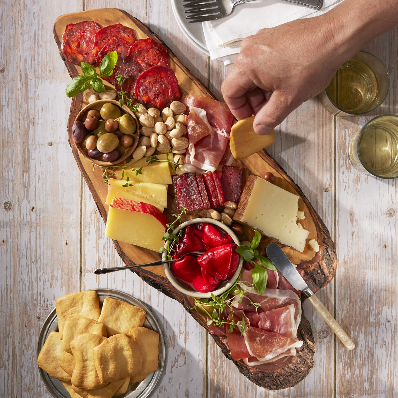 Create a Spanish charcuterie board that will impress your guests. You will start with a beautiful rustic olive wood serving board from Mallorca, then cover it with Spanish delicacies like sliced jamón, aged cheeses, roasted peppers, Marcona almonds, mixed olives, chorizos, artisan crackers and membrillo preserve.