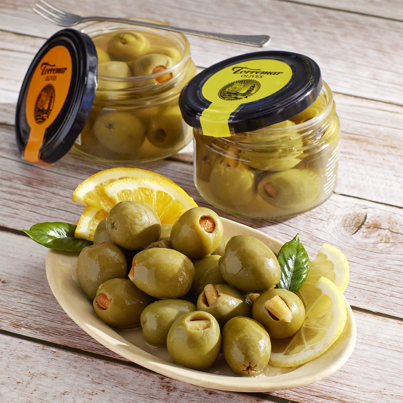 This duo includes one jar each of lemon peel stuffed and orange peel stuffed olives.