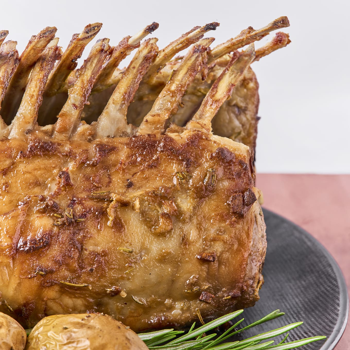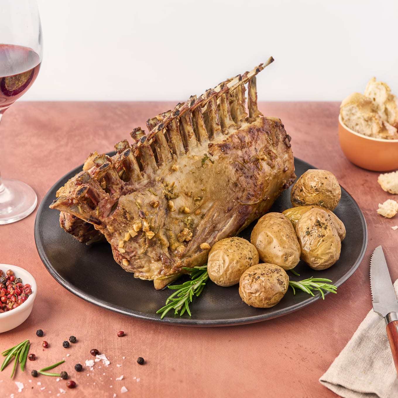 These two full lamb racks are expertly Frenched, with the bones carefully trimmed for an elegant presentation. As they roast, the exterior caramelizes to a golden crisp, while the meat inside stays tender, juicy and flavorful.