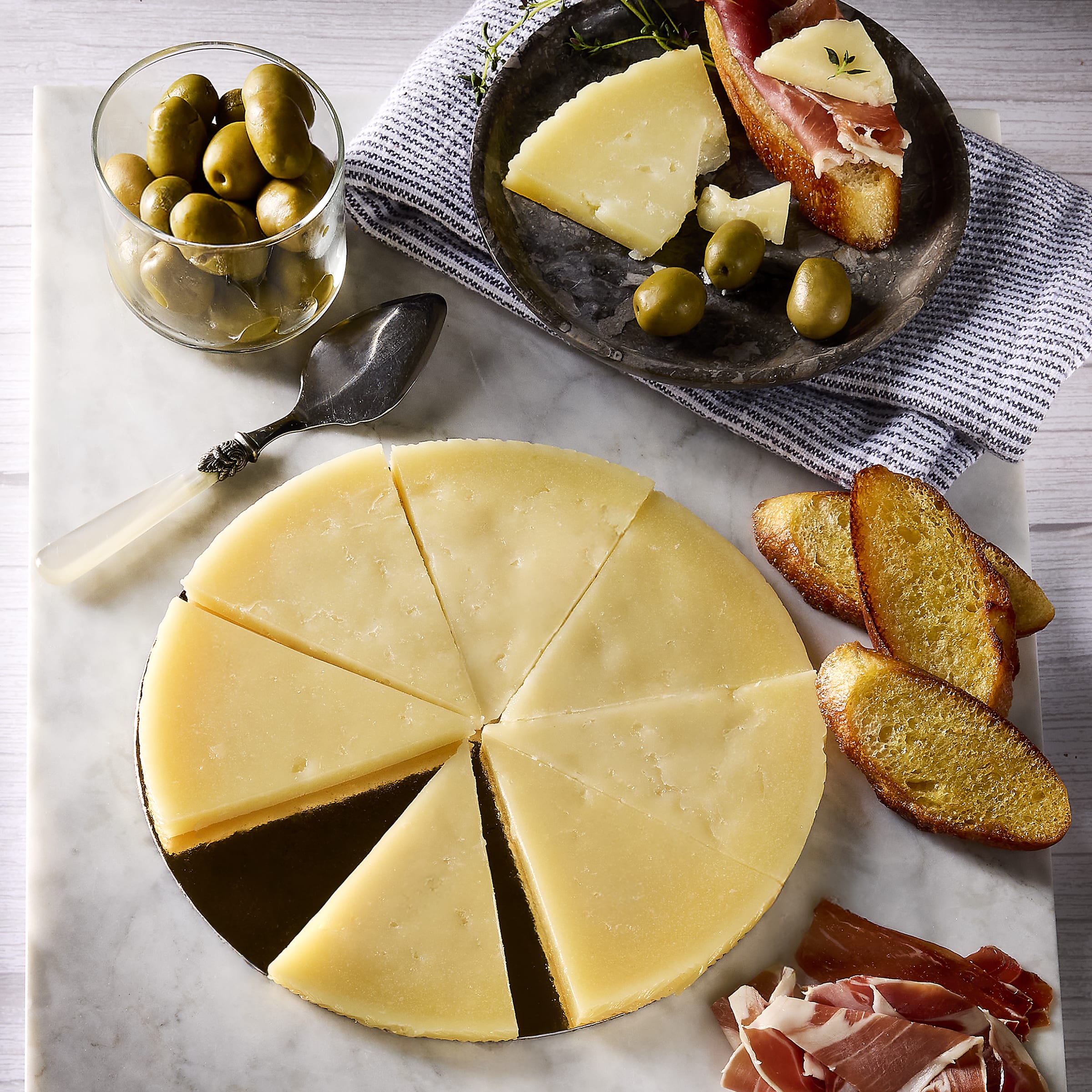 This handmade cheese, made by the Villajos family, is Manchego at its best. Each bite of this aged cheese releases a full nutty flavor and a pleasantly bold sharpness. This tray holds perfectly portioned hand-cut slices of Reserva Manchego, ready to be served alongside fruit, Ibérico ham or marcona almonds.