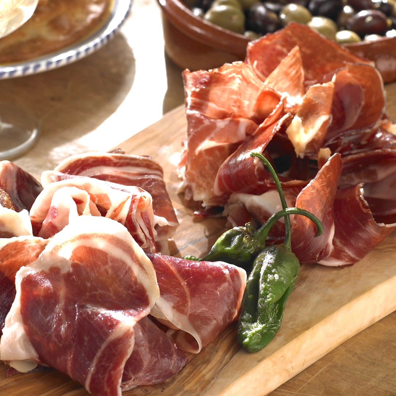 Jamón Ibérico de Bellota comes from Ibérico pigs that range freely across southwestern Spain, consuming huge amounts of acorns ('bellotas' in Spanish). This wonderful combination of diet and exercise, along with expert dry-curing, creates what many connoisseurs call the finest (and healthiest) ham in the world.