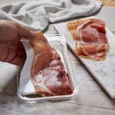 Each week we slice our Ibérico hams to ensure the thinnest, most delectable slices. You will be able to see the difference between the sliced Ibérico and its big brother the 'Bellota’ by the fact that the Bellota ham's mono-unsaturated fat glistens on each slice of ham.