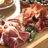 Jamón Ibérico comes from the native black Ibérico pigs, found only in Spain. Its dark red meat and rich, complex flavor are best enjoyed at room temperature with a fine wine and not much else.