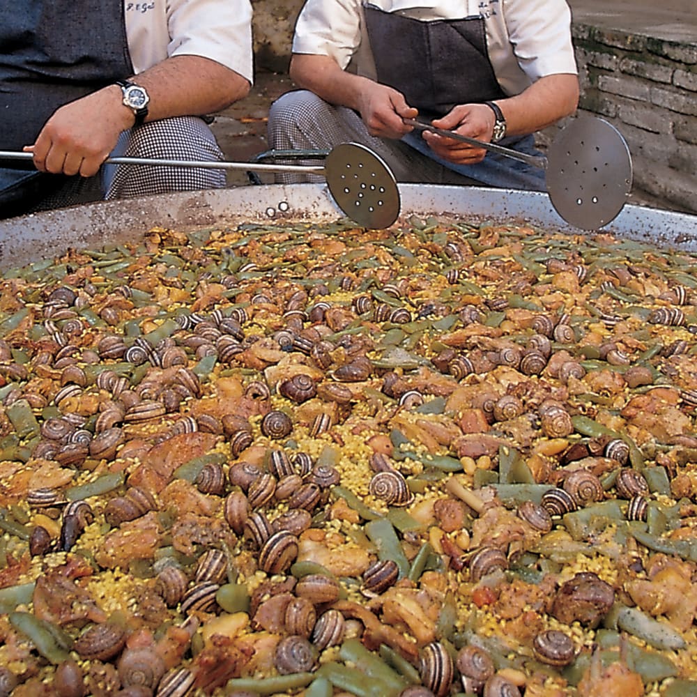 Before you know it, he will catch your eye and invite you in. Donning a simple apron, made of the same cloth used to bag the cooperative's rice, he will move to the rear where he will scoop out a portion of homemade paella and serve it to you with a warm and generous smile. His favorite is a family recipe made with snails and rabbit. During the time of any fair, perhaps 5,000 people will enjoy paella made by an unassuming paella maestro!