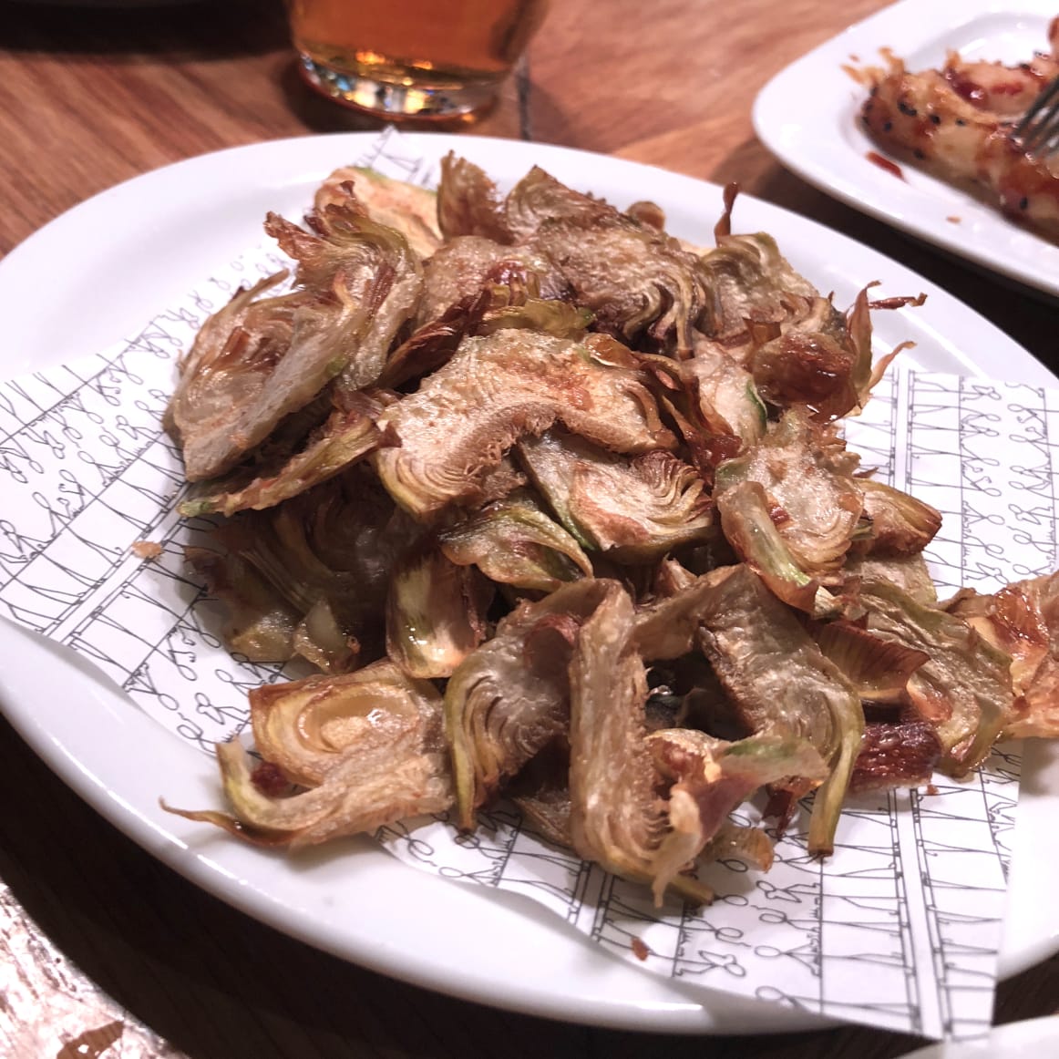 Crispy fried wafers of fresh artichoke served with a refreshing drink is a newly popular tapa that deserves to become a classic. During our recent trip to the Alimentaria food show in Barcelona it seemed like fried artichokes were featured at every tapas bar we visited. Hopefully in a few years it will be so ubiquitous that we will start presuming that it was always a favorite!