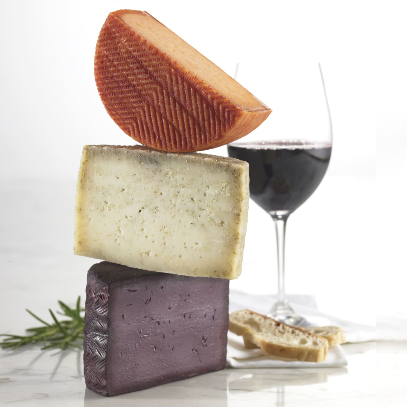 The first is fundamentally a Manchego cheese, but at the very earliest part of the cheesemaking process ground fresh rosemary leaves are blended with the sheep's milk, imparting the aromatic flavor of the La Mancha countryside. The second is a mild, tangy goat and sheep's milk cheese mixed with red wine which adds a touch of sweetness and a delightful wine aroma. The last is also a goat and sheep's milk cheese with the distinctly Spanish flavor of smoked paprika from La Vera - the bright orange color comes only from this vibrant spice. All three are made using very fresh raw milk.