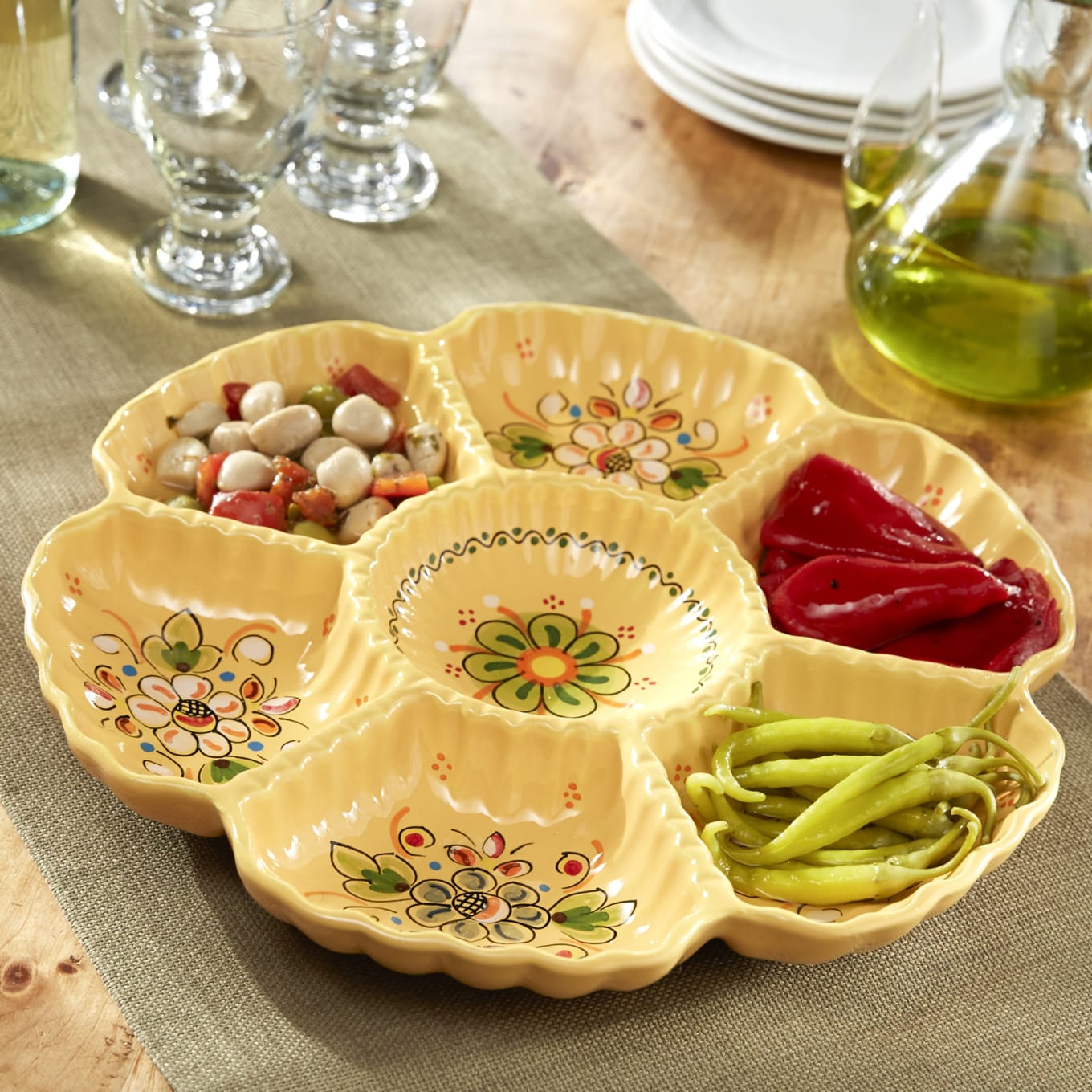 Imagine sugared almonds, mounds of olives, piquillo peppers and other tempting tapas filling the compartments of this beautiful, handcrafted appetizer tray. Serve traditional Spanish fare in a charming and functional piece of culinary art. A simple, yet striking design makes it an attractive addition to a party spread or a lovely kitchen decoration propped up in a cozy corner.