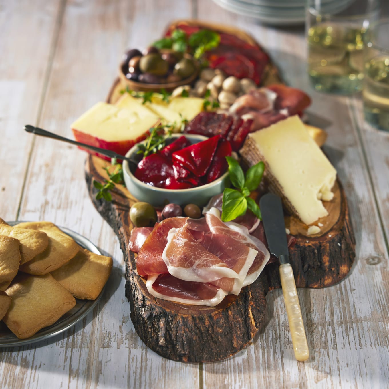 Create a Spanish charcuterie board that will impress your guests. You will start with a beautiful rustic olive wood serving board from Mallorca, then cover it with Spanish delicacies like sliced jamón, aged cheeses, roasted peppers, Marcona almonds, mixed olives, chorizos, artisan crackers and membrillo preserve.