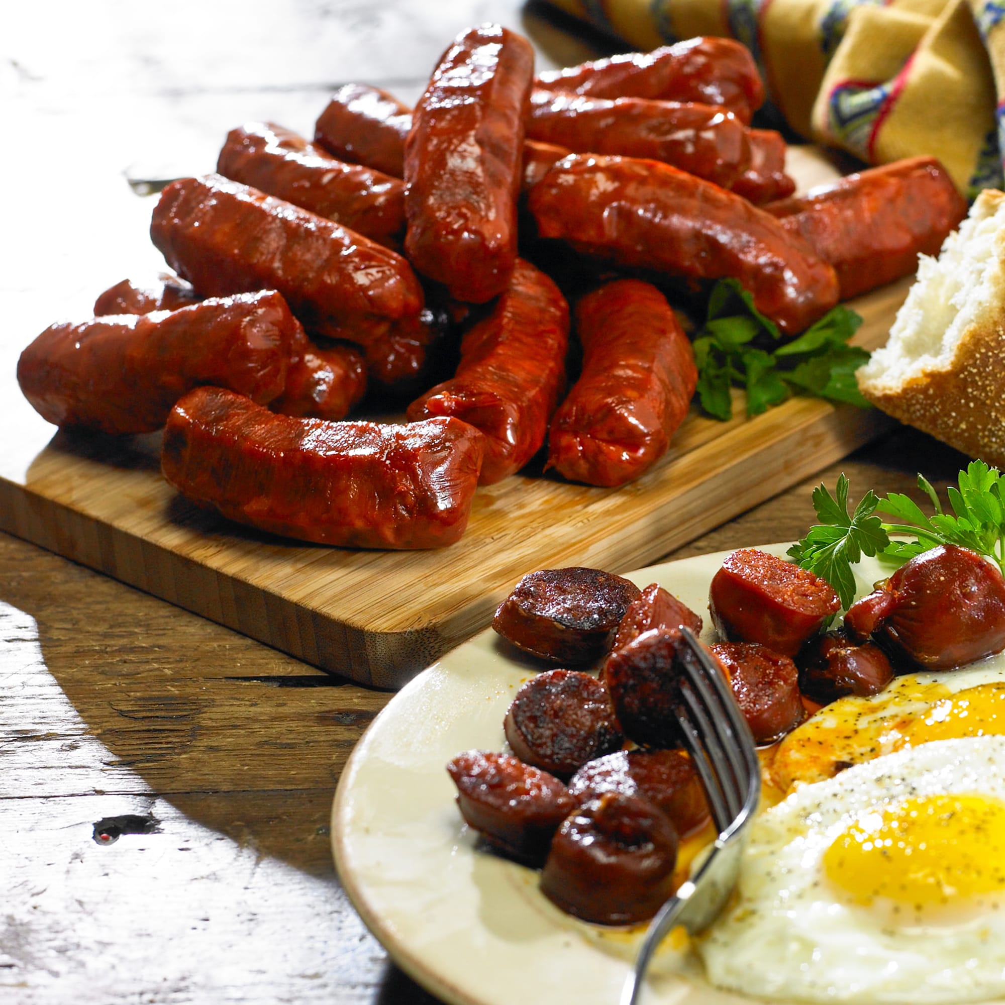 Their smoky flavor comes from the famous pimentón de La Vera, smoked paprika, that lends its flavor to all Spanish chorizo. Garlic and other spices add a complexity to this pork sausage.