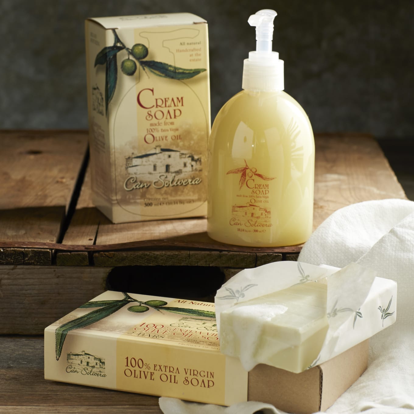 Each bar of Can Solivera extra virgin olive oil soap is cut and wrapped by hand at the estate. After years of research, the owners created a liquid version of their famous olive oil soap as well, which comes in a convenient pump bottle. This set consists of a box of two rustic bars plus a bottle of the liquid soap.