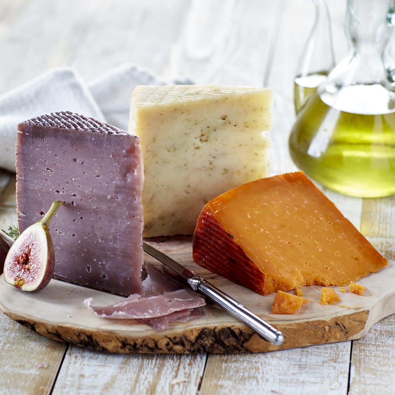Enjoy this flight of three flavorful cheeses from La Mancha. Each one is infused with a distinctly Spanish flavor which creates a colorful display for your table. Fresh rosemary leaves, red wine and smoked paprika are blended directly into the cheeses so that each bite is full of the flavors of La Mancha. Serve this collection at your next wine and cheese party! Each wedge is individually wrapped, then packed by hand to make the perfect gift for the cheese lover.