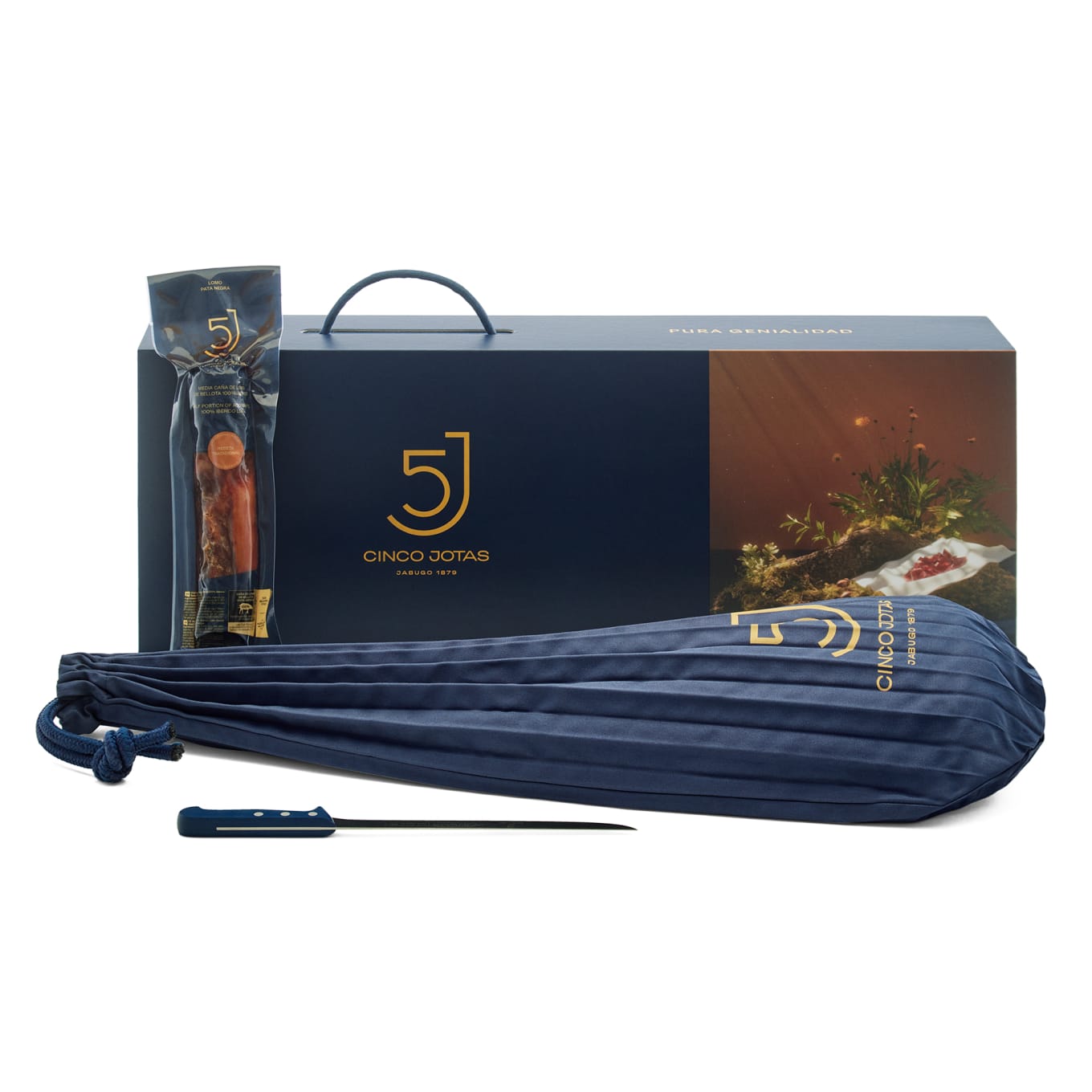 This deluxe box contains a treasure of Spanish cuisine. Cured Ibérico de Bellota paleta made from acorn-fed, pasture-raised pork is Spain's treasure. And Cinco Jotas is Spain's premiere brand. Included with the whole, bone-in shoulder are a whole cured lomo pork loin, forged Arcos knife and stainless-steel serving tongs monogrammed with the Cinco Jotas logo.