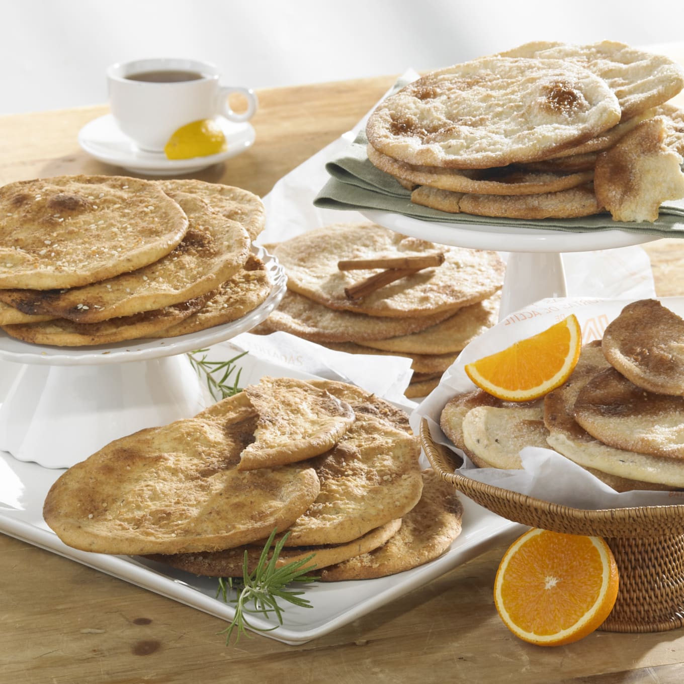 This selection includes a wide range of flavors, both savory and sweet. The classic tortas de aceite are lightly sweet, with a hint of anise. We included two other sweet versions, one with sprinkled with cinnamon sugar and the other with the essence of Sevilla oranges. Sweet tortas are often served with coffee across Andalucía, and are a wonderful dessert or breakfast treat!