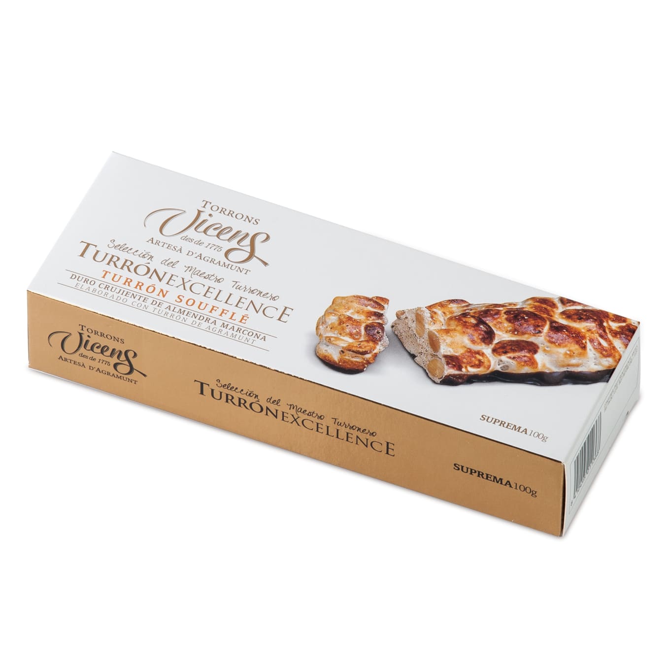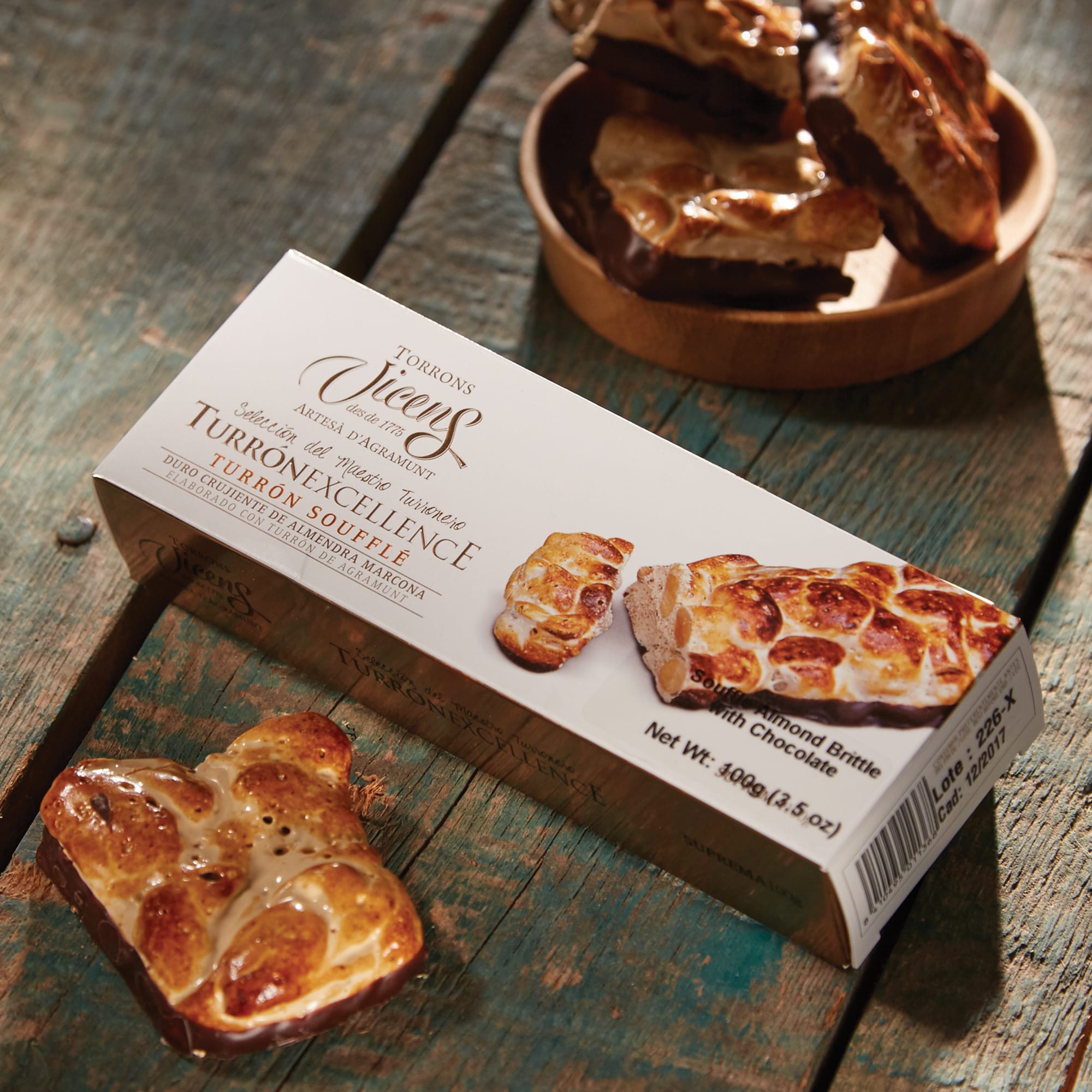 This new toasted souffle turrón starts when honey, sugar and egg whites are heated to form the nougat mixture, then whipped to add air and lightness. Freshly roasted whole almonds are then folded in. While the mixture is still warm, the bar of turrón is formed by hand, then toasted to a golden brown. Finally each piece is dipped in fine dark chocolate.