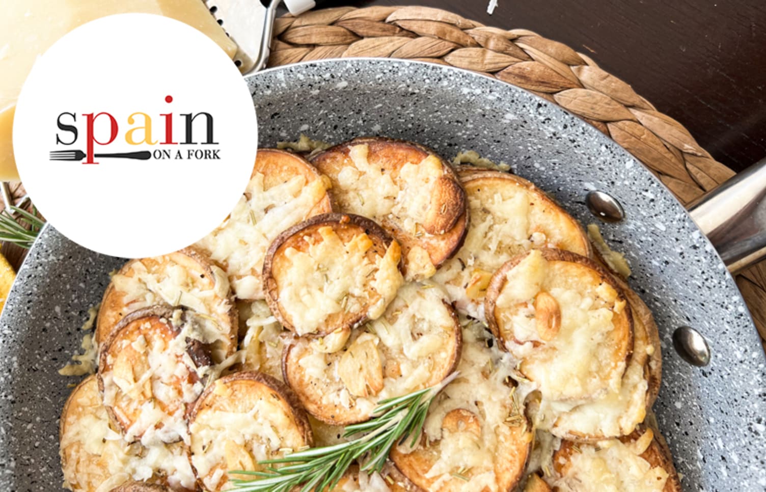 Add 1/3 of the potatoes into an oven-proof fry pan (you can also use a casserole dish), all in a single layer and stacked around each other, top off with 1/3 of the shredded manchego cheese, some slices of the sauteed garlic and a pinch of dried rosemary, continue in this method until fully assembled.